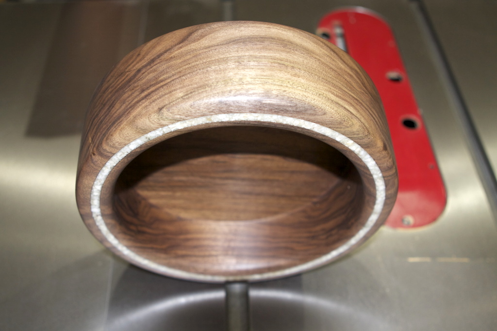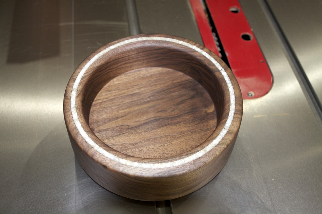 Well I think I got my hand somewhat around turning a Inlay Bowl. I got a lovely peace of walnut that I turned in to a key bowl for my wife. She wanted something we could drop our keys in when we walk into the house. I used epoxy and crushed white marble to achieve this. I am very new to woodworking, Turning and inlaying – so if the epoxy was not the correct method please advise of any better method out there. The bowl was finished with Tung Oil and came out beautifully. It very solid and weighs quite a bit.