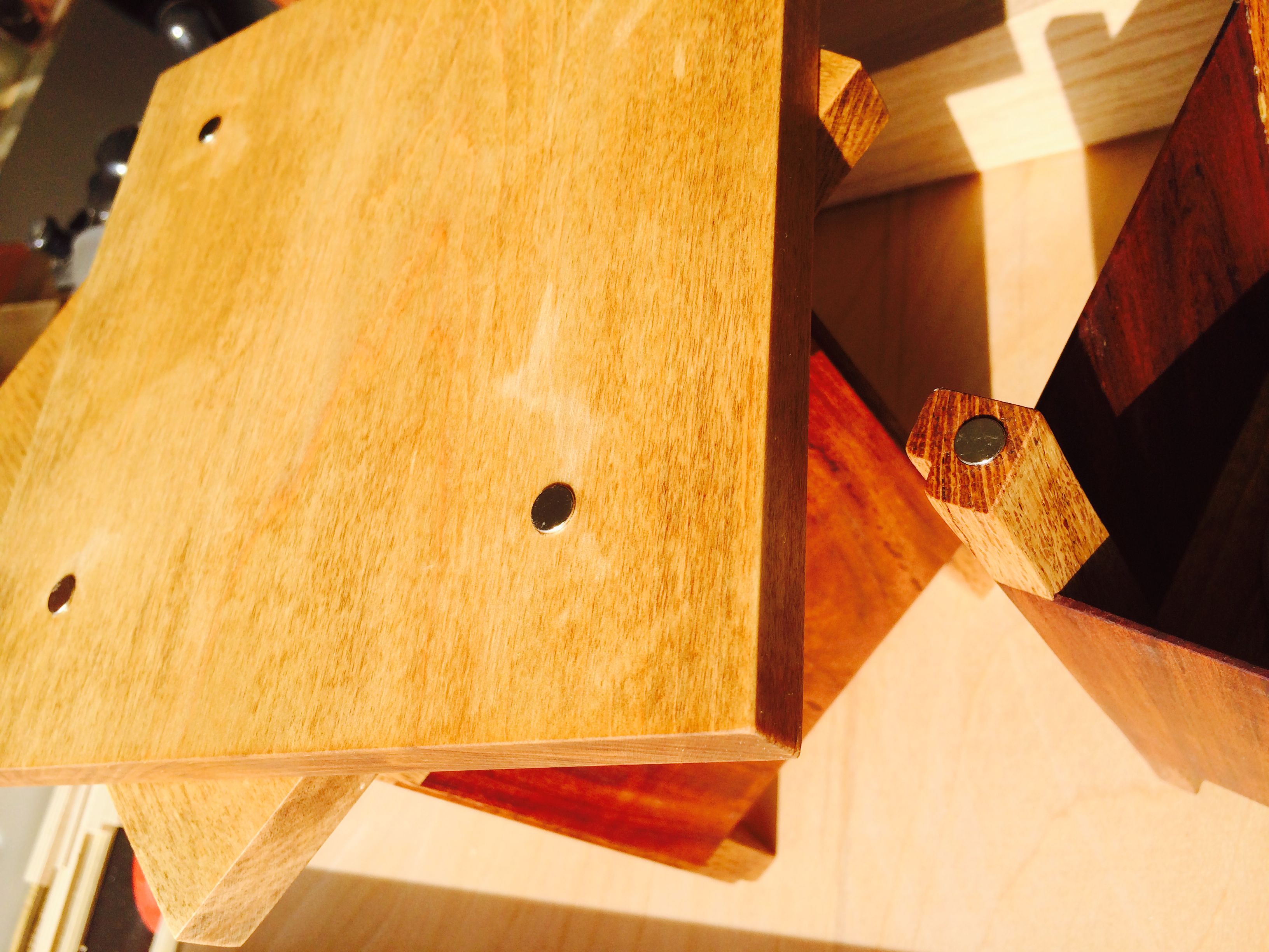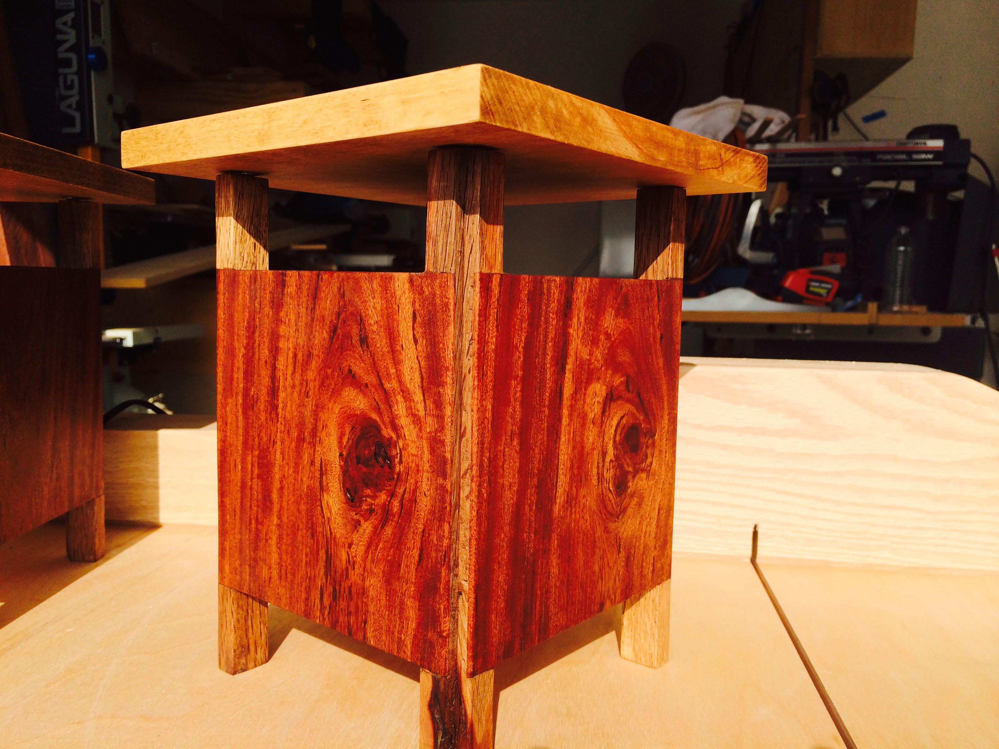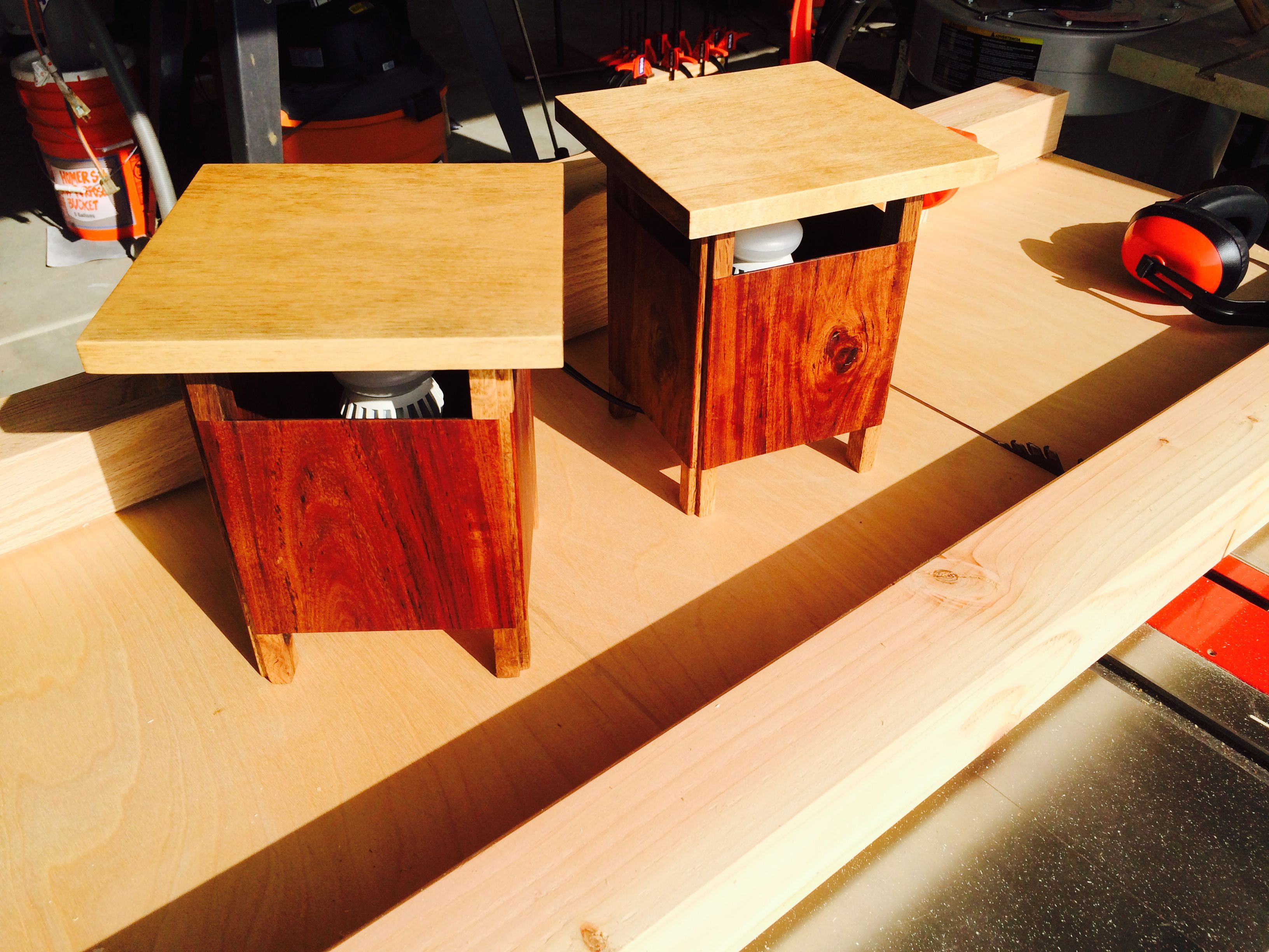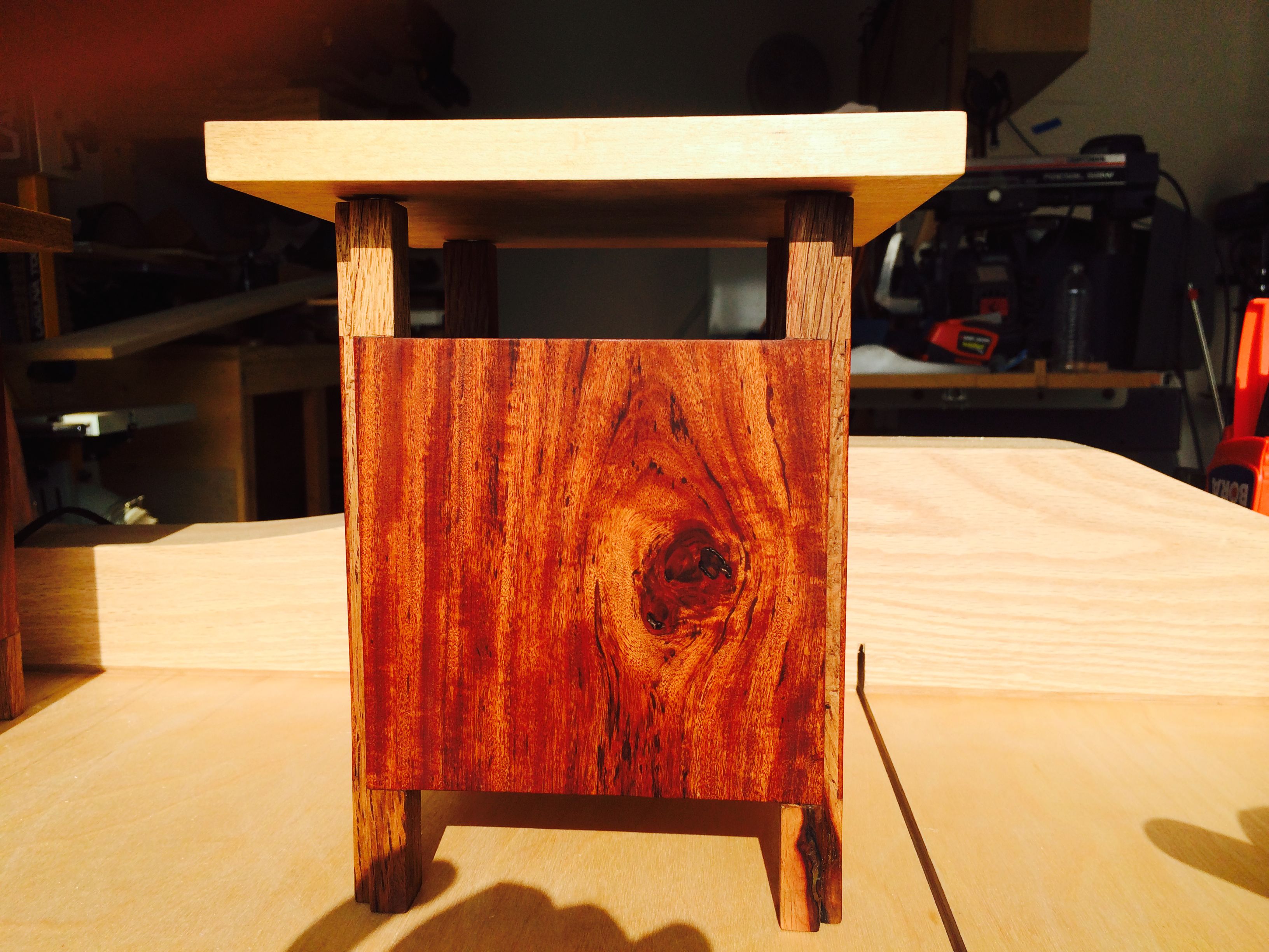 I started with the legs and the sides of the lamps first. Once that was assembled I could measure the exact size and shape of the bottom of each lamp, I lucked out and they were exactly the same size. The re-sawed bottoms was installed with a little recess when they were glued in. I cut the top oversized out of the maple and gave it a very light stain. The top was cut to size and the magnets was installed. The whole project was sanded and finished with Teak oil.