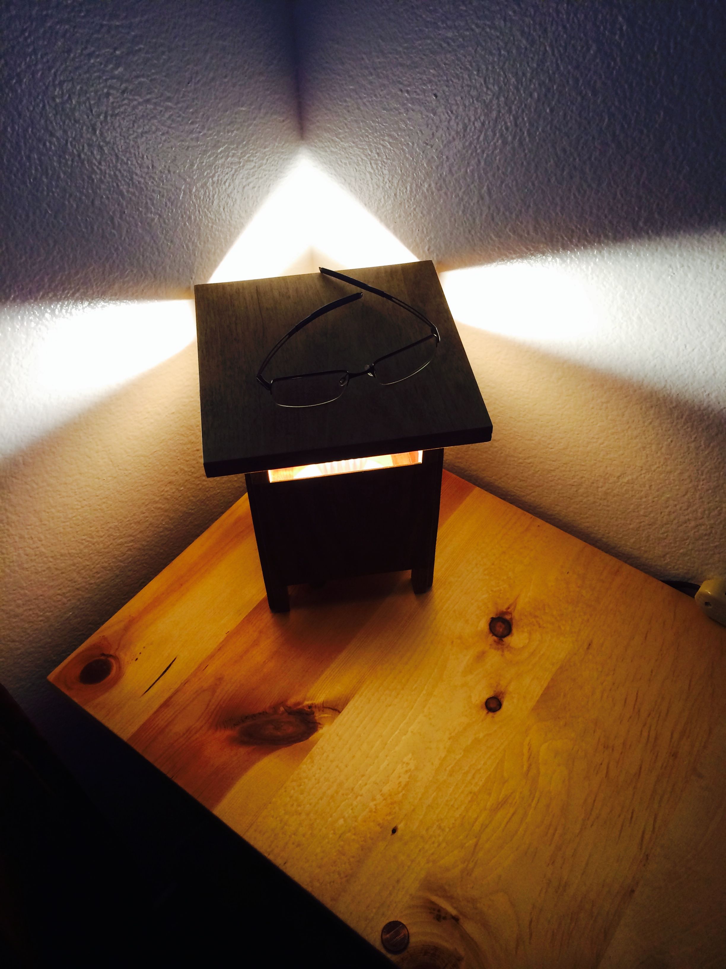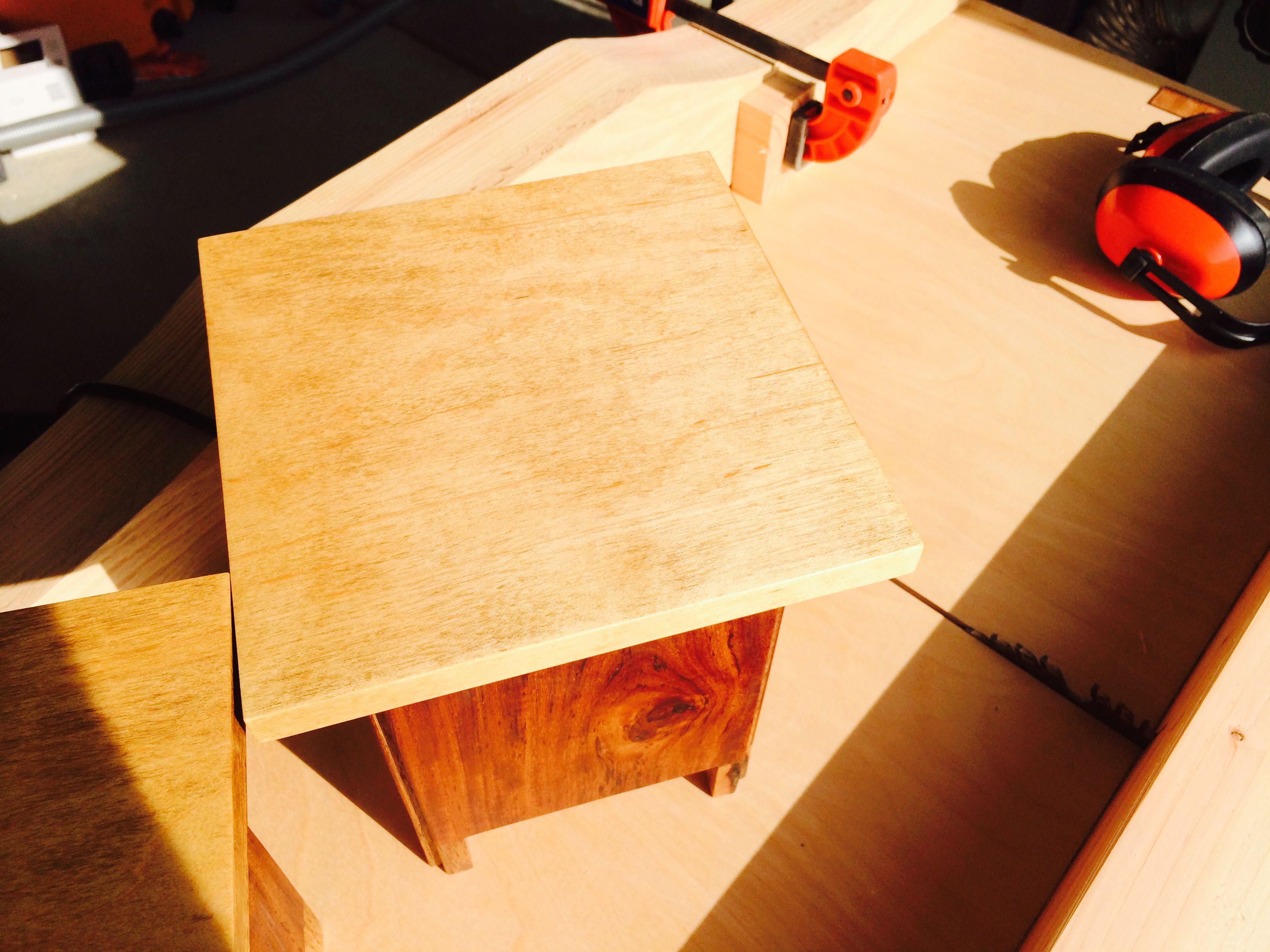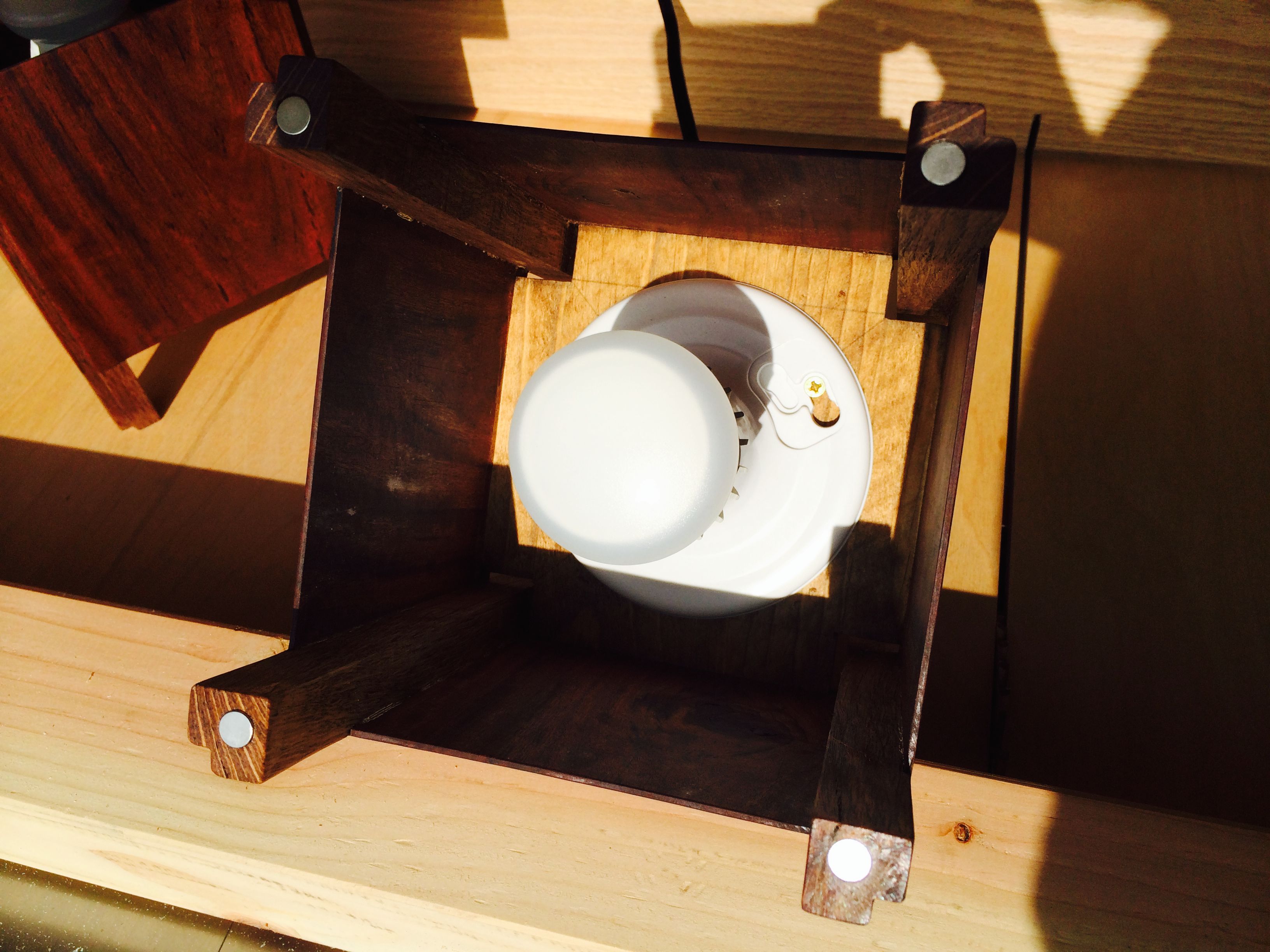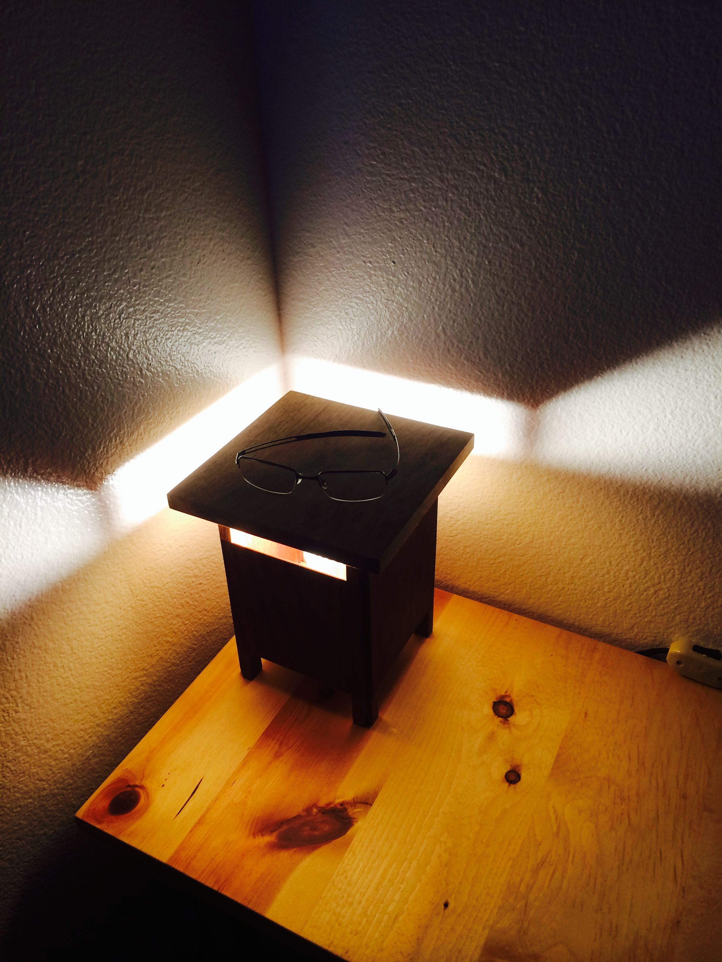 I started with the legs and the sides of the lamps first. Once that was assembled I could measure the exact size and shape of the bottom of each lamp, I lucked out and they were exactly the same size. The re-sawed bottoms was installed with a little recess when they were glued in. I cut the top oversized out of the maple and gave it a very light stain. The top was cut to size and the magnets was installed. The whole project was sanded and finished with Teak oil.