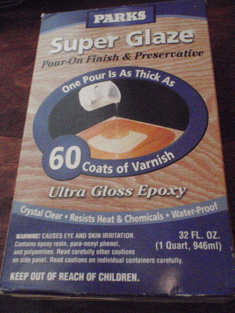 I have this old crate that my Laguna jointer planer was shipped in, I was using it as a temporary work service and storage inside the crate. It just cheap chipboard so a lot of wood fibers that stick out and scratched the items I’m working on. I decided that this has to end and since Im going to use this for a while, the idea popped in to my mind to epoxy it. I Got a box of Super Glaze – Pour On Finish & Preservative from a friend about a year ago and it has expired — I think. The desk was sanded to a smooth surface with 80 grid sandpaper. After the epoxy dried I sanded it with 220 grid to make sure the are no sharp edges. The service look very good after a bout of Renaissance wax.