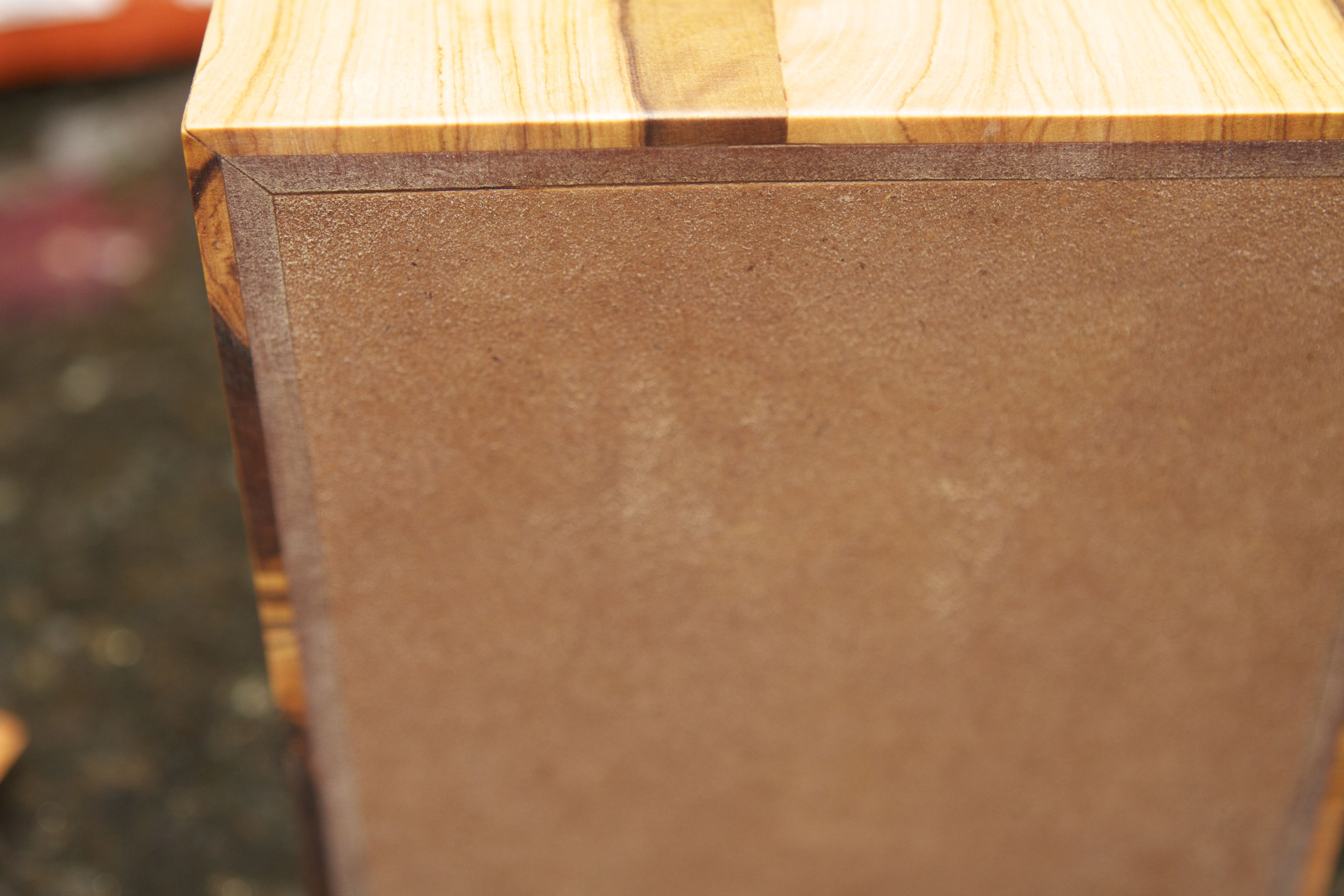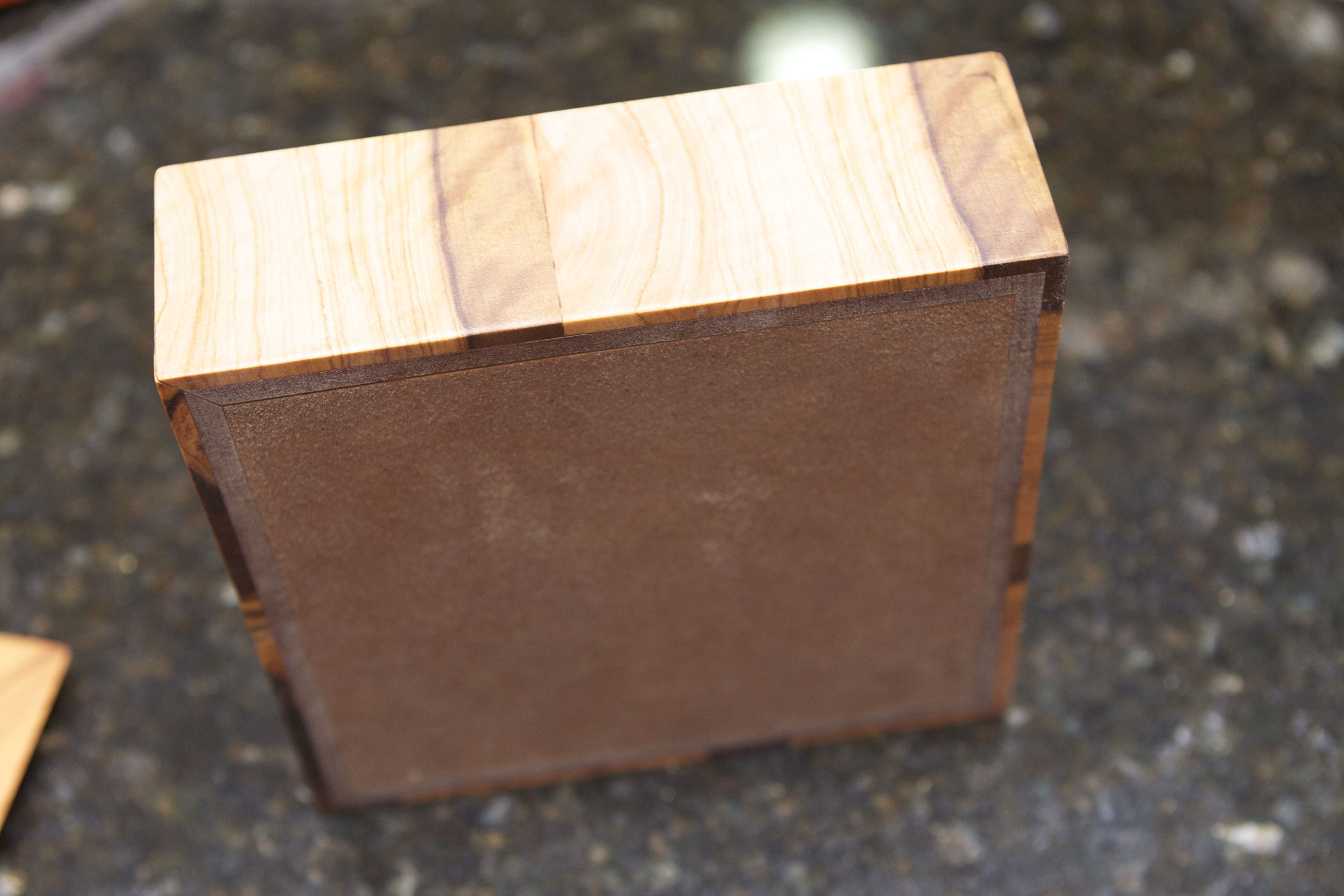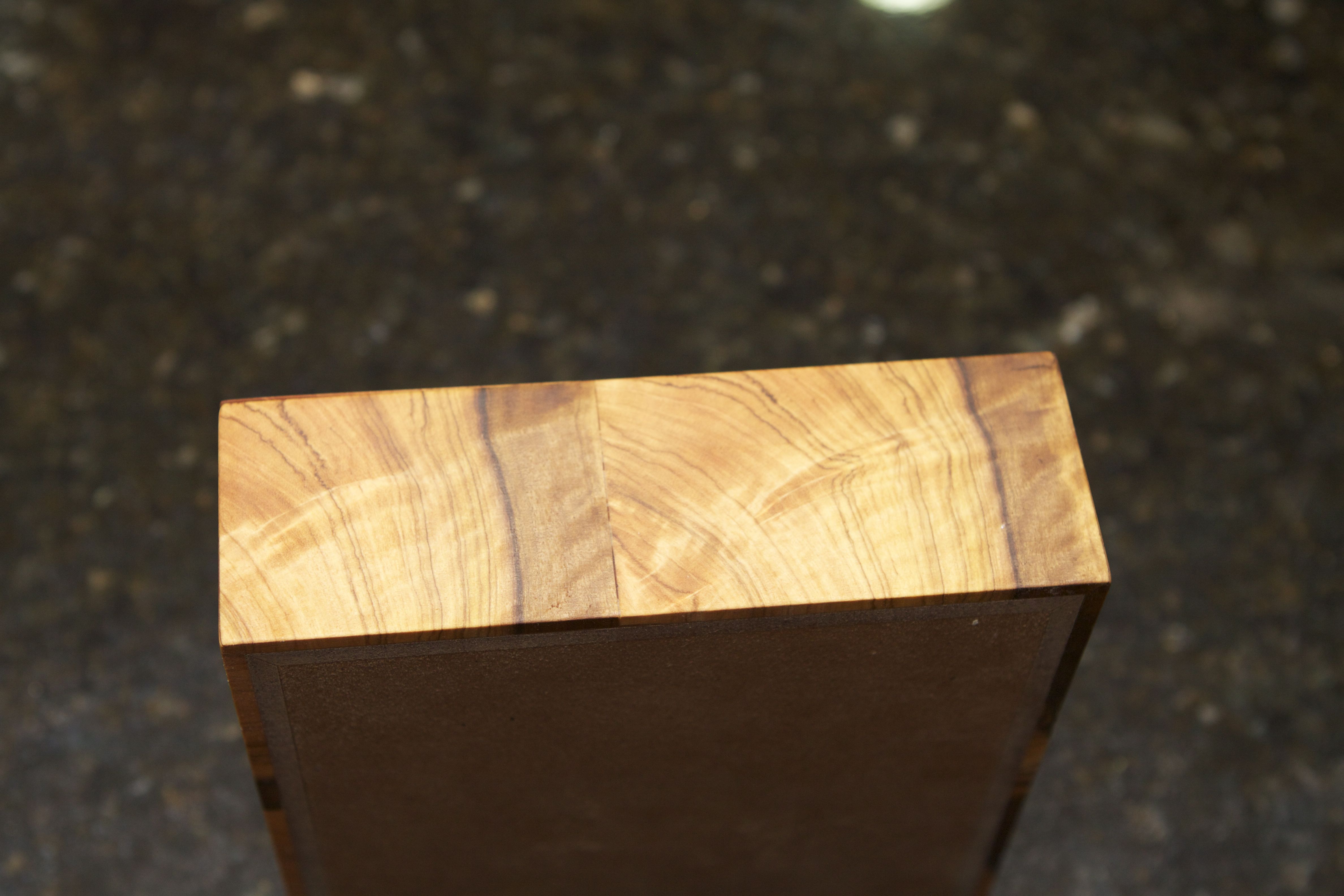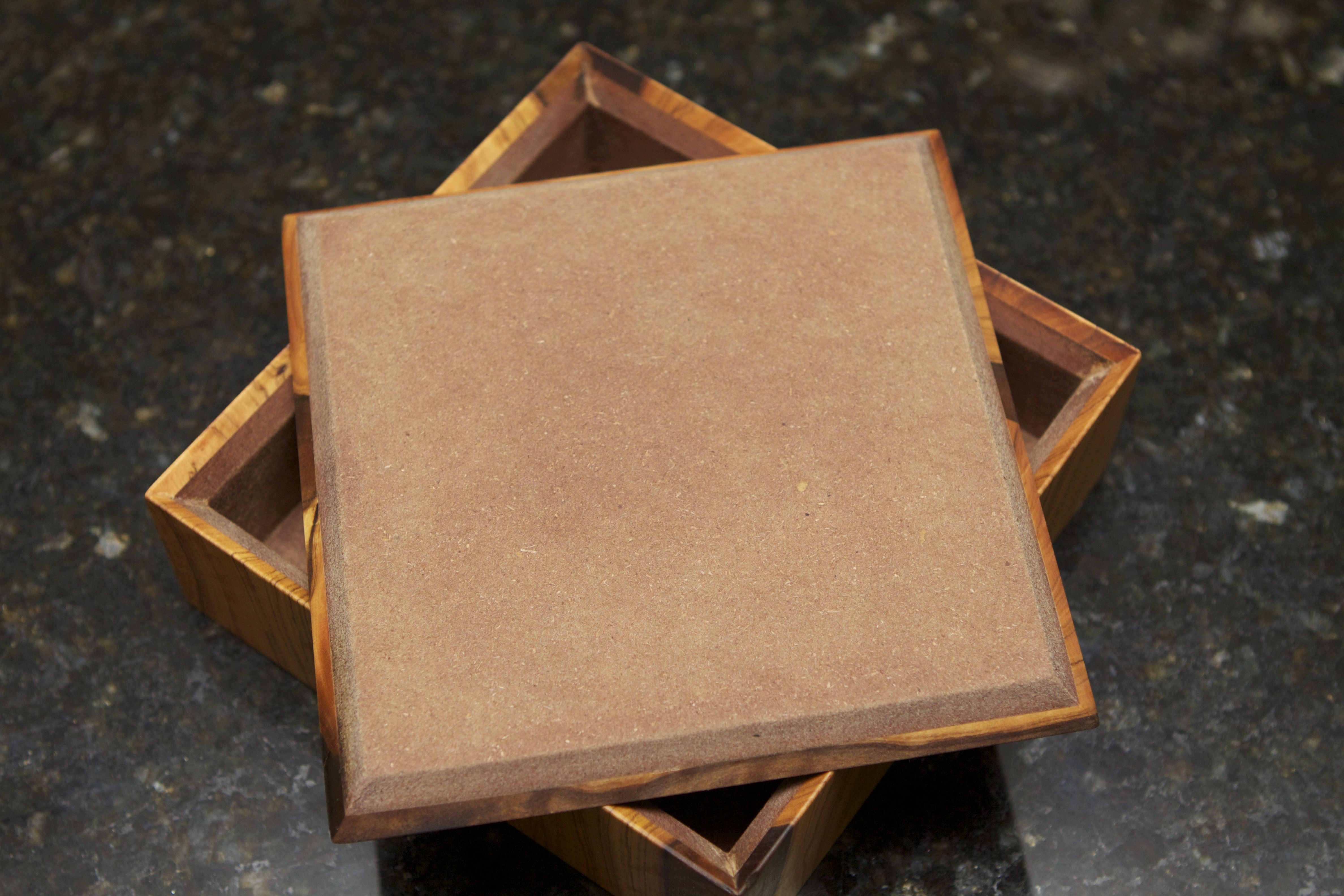 I had some left over peaces of wild olive that I veneered to a peace of MDF. Was not very big so build small square box. My doughtier lowlives it…